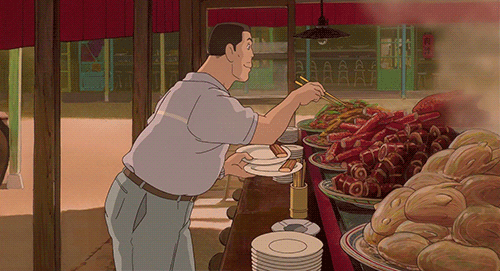 When talking Miyazaki food scenes, everybody references Howl’s Moving Castle, but for my money, but really just my stomach, I’d go with Spirited Away. And not the scene where that giant depression ghost known as No Face is gorging himself on whole hogs before taking a filth bath. I’m talking about the scene in the first ten minutes where Chihiro’s parents discover this giant buffet table, stocked with various porks, steamed crab, dumplings, ducks, cornish game hens, and what honestly looks like chocolate swiss rolls. Despite being animated and completely surreal in design, this food looks frigging amazing. I’m sitting here all starving on my diet, daydreaming about just railroading these swine sticks into my cheese chugger. (Streaming on HBOMax)