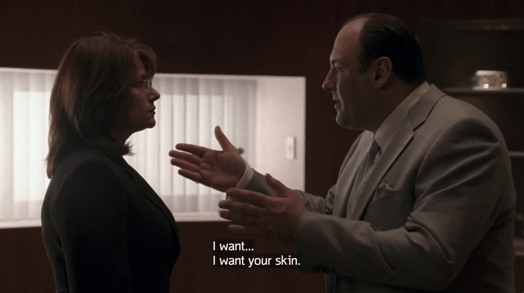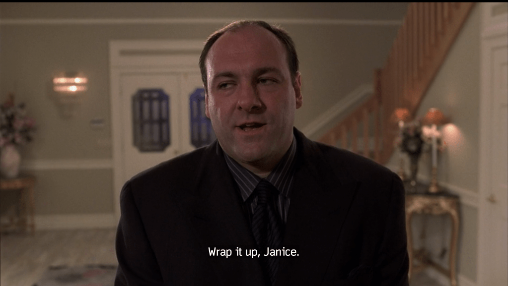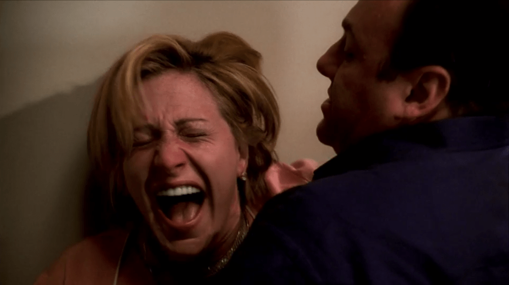 The most jaw-dropping, out-of-left-field moment of the entire series is when Janice blows Richie away at the dinner table. After an argument about his son possibly being gay, Richie punches Janice in the mouth, prompting her to come back with a glock and gun him down, once in the chest, once in the head. The look on Richie’s face is priceless, he’s as shocked as we are, in what few seconds of life he has left. This prompts Tony to have to come over and dispose of the body, giving us an incredible series of scenes between Aida Turturro and James Gandolfini that are dark, sad and accentuated by hilarious one-liners. Everyone always talks about the chemistry between Falco and Gandolfini, it’s undeniable, of course they do, but the chemistry between Gandolfini and Turturro as siblings is absolutely spot-on as well. Here’s my favorite exchange from this episode: