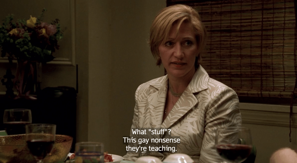 Whelp, the cat’s out of the closet. After being spotted by the crew in a Village Person’s outfit, Vito goes on the lam fearing what they’ll do to him for being gay. He goes to a really New Hampshire charming bed and breakfast and falls for a short order cook that owns a diner who kind of looks like my stepdad. It’s all a tad adorable and I certainly like “out Vito” more. Unfortunately, for the Soprano crime family, it’s still 1954 and they can’t get down with Vito’s hairy bedfellows. They run him out of town and what ensues is a bunch of asshole bigots in see through socks exchanging violent and thoroughly not creative homophobic jokes that hint that maybe some of them are little gay. This episode would work far better if the actor who played Vito, Joe Gannascoli, was better – there I said it. He’s not a very good actor so his entire arc (and it’s a fairly well-written one) for Season 6A doesn’t hit as hard as it should. It’s a shame. This might be the only time the mob genre has tackled homophobia at such length. B+