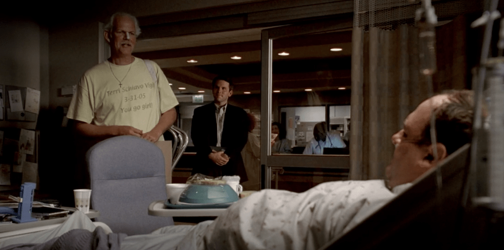 This is a decidedly very weird episode of The Sopranos‘ Season 6A that seems the most out of place. There is some good comedic elements like Bobby getting hired to shoot a rapper in the buttocks or the return of Janice’s born-again, narcoleptic boyfriend sporting a “Terry Schiavo – You Go Girl!” t-shirt that seems like something Janice made or at least had the idea for. However, we’re more than ready for Tony to exit the hospital at this point, no matter how compelling guest star Hal Halbrook is. B-