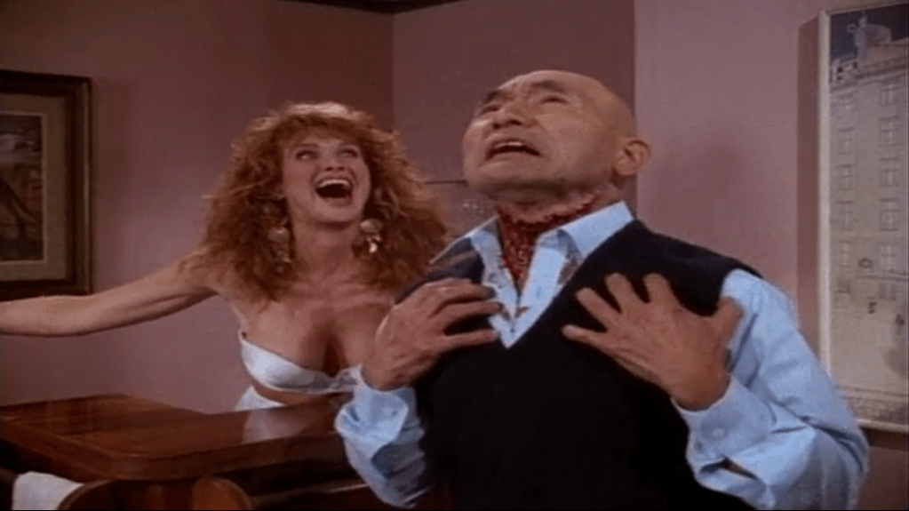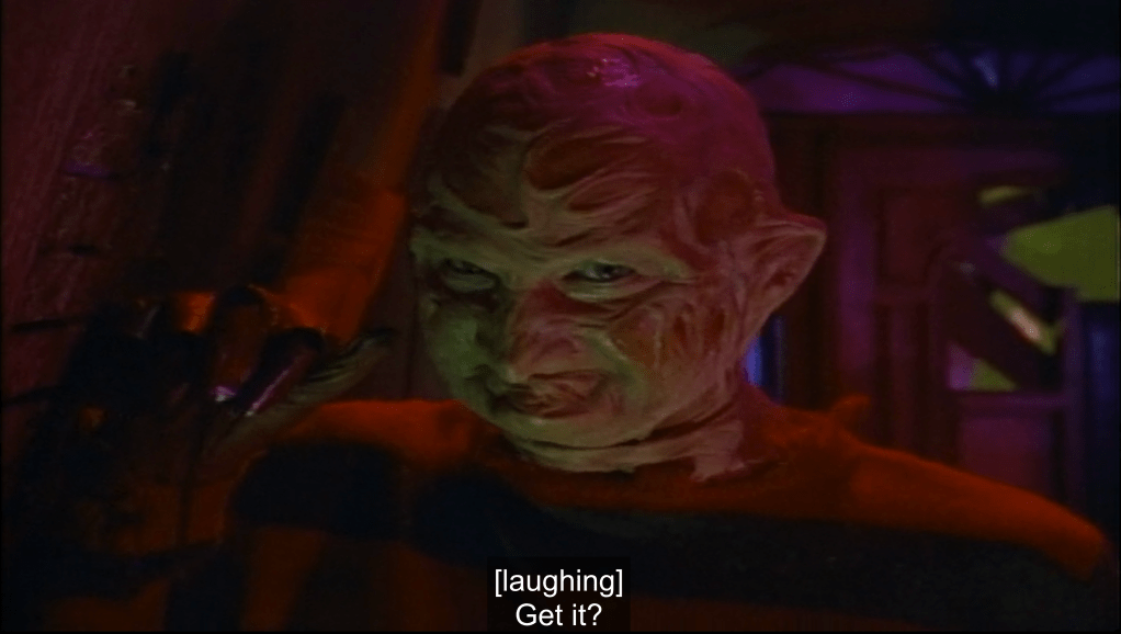 Anyway, not soon after that, she dies or kills more people or something, and then that story ends and the second story of the episode begins. It’s about a hacky Hollywood screenwriter played by the dude who played Robert of Robert’s Gourmet Goodies on Frasier. He doesn’t have his French accent, but he’s pretentious enough without it. He’s visiting Springwood, OH for his dumb high school reunion while struggling to finish a script for his editor. He’s having money problems because he’s a writer (LOL) and this might be the end of his career. However, there’s light at the end of the tunnel – Freddy Krueger was in the same graduating class as him so maybe he can just write Freddy’s life story as a movie and sell it? That pisses Freddy off, who appears at the high school reunion to fuck with the writer. Everyone ends up dead and Freddy retains the rights to his story. A happy ending for the ages. Audrey, what did ya think?