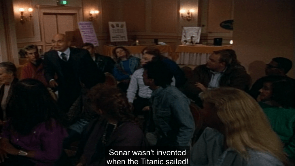 Well, for someone seemingly obsessed with the fucking Titanic, this woman, who is dressed as a bedsheet, knows…truly nothing about the Titanic. She “channels” William Murdoch, first mate of the Titanic, who is apparently…a pirate? And likes to show up in a hotel conference room and reenact his death? And here comes this fuckin guy, standing up and declaring himself a “professional skeptic,” which, my god, if that’s an actual job then I’m leading entirely the wrong life.
