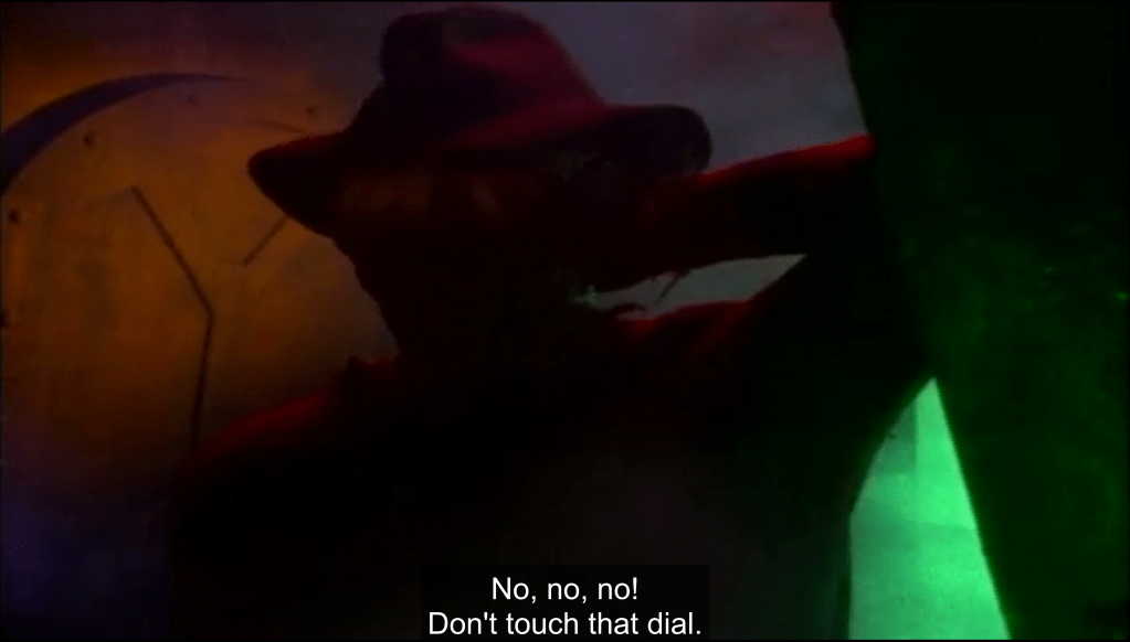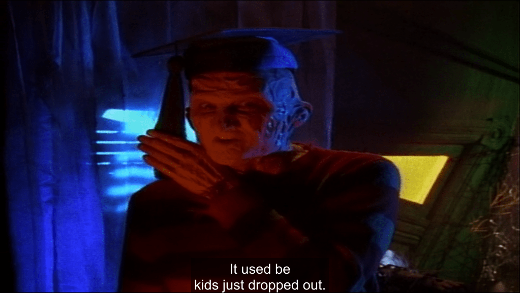 Audrey, we’re like twelve or thirteen episodes deep into this dumb show at this point and I always thought (and I assume you have too) that the reason these stories are so unrelated and hard to follow is because the studio execs or whatever made them combine to half-hour episodes into a full hour show for scheduling block reasons. I’m here to tell you that is NOT the case. Last weekend I watched a four-hour documentary on the Nightmare on Elm Street series, and when they talk about this show, they say the initial idea was to do two vaguely related half-hour stories in a single episode. THIS CONFUSING SHIT WAS THE PLAN FROM SQUARE ONE! WTF?!