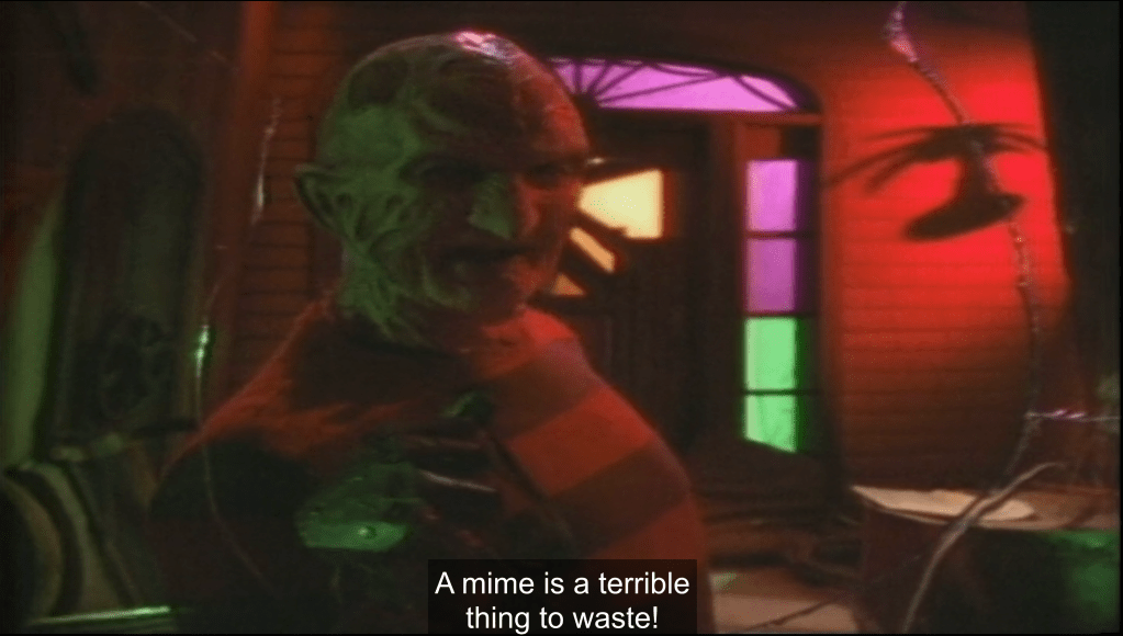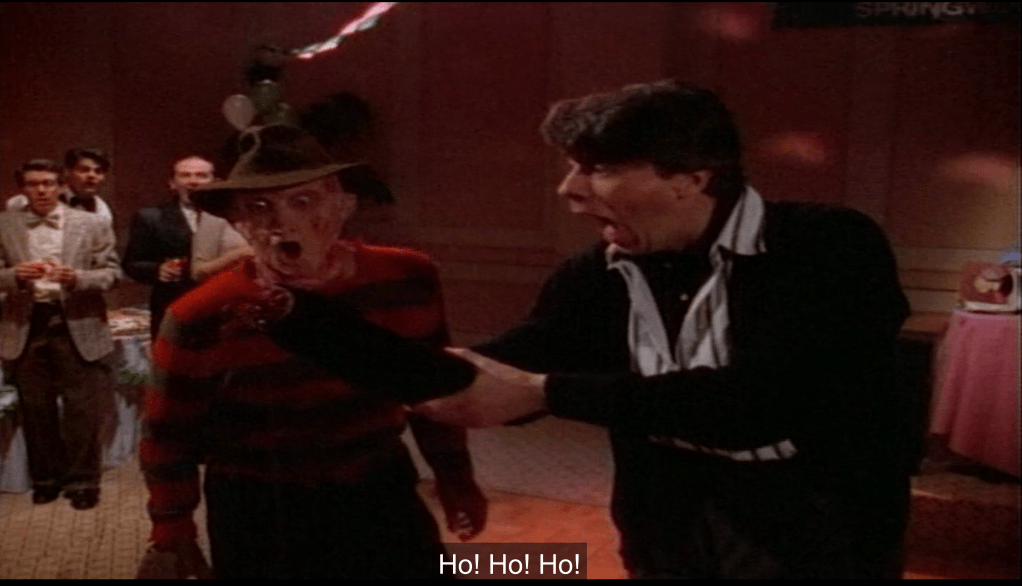 The writer’s girlfriend finds out about Freddy’s origin story, and reveals that FREDDY ASKED HER TO GO TO THE PROM WITH HIM. And she said YES as a JOKE! Well, lady, he’s back and here to kill you, which of course he does, and unfortunately, your famous writer boyfriend is too concerned with hanging out with Freddy’s dorky high school BFF and using this whole fucking story for his next movie to give a shit. And…oh for the love of christ, he’s literally writing A Nightmare on Elm Street. Freddy kills him and the BFF steals the script and writes the movie. Good for him. At least he was actually FRIENDS with Freddy. A happy ending, in my book!