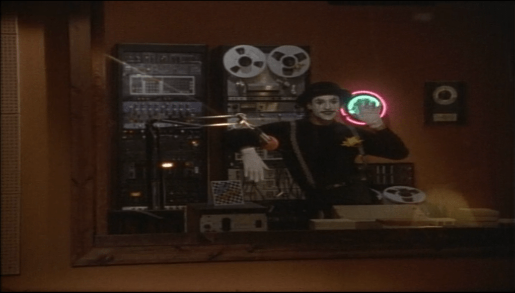 Freddy’s Nightmares loves a good central asshole and it’s difficult to think of a more ridiculous one than the PayLess Shoes version of Howard Stern in this episode. Rick Rake really tells it as it is or in his words, “I say what I mean and mean what I say.” After ragging on “fat, ugly people” for a good five minutes he receives a comically large bag of fan mail and immediately we know this episode is going to be about this asshole losing everything. He and his wife are watching a mime on the streets of LA when a weird fanboy tries to harass them. Rick flies off the handle and accidentally punches the mime, who ends up trying to sue him. This sends Rick into an odd temper tantrum where he begins trashing mimes on the air and referring to them as one of the leading problems of life in 1980s America. Maybe “trashing them” isn’t an accurate term, because he literally calls for their murder over the air. He encourages his audience to go out and physically harm mimes.