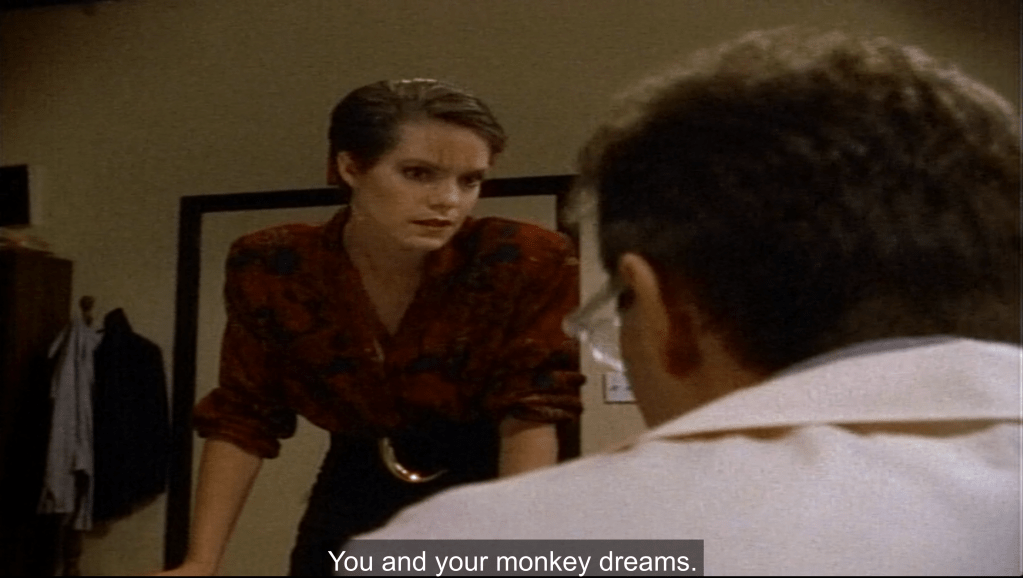 PIVOT TO –> REPUBLICAN SCIENTIST. He’s clearly very jaded by the cruel politics of the scientific community and has a real “fuck everyone who isn’t me” attitude. He backs it up with absolutely no courage and two healthy scoops of ignorance. He has nightmares about environmental groups hunting him down like Rambo and stealing his federal grant money, probably for pot bongs and abortions, in his mind. The Monkey Scientist tries to tell him they need to stop experimenting on and torturing the poor little monkey in the episode but he says she’s an idiot who wears her heart on her sleeve and should grow the fuck up. He also fantasizes about having sex with her but fears she loves animals so much she might turn into one and kill him. This guy sucks. He’s afraid of literally everything! Anyway, Monkey Scientist ends up trying to free the poor monkeys and Republican Scientist fires her for being a liberal piece of shit. It ends with him having bad dreams about monkeys and a monkey having bad dreams about him, where Robert Englund prompts us to think about it. Think about all this random horseshit that meant absolutely nothing at all. Let’s all take a moment and do that.