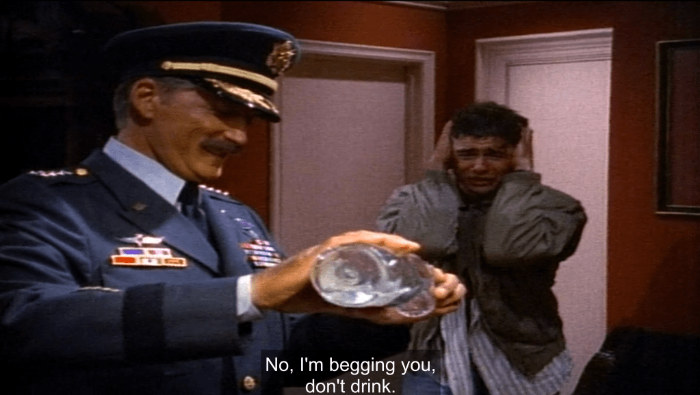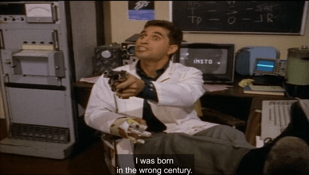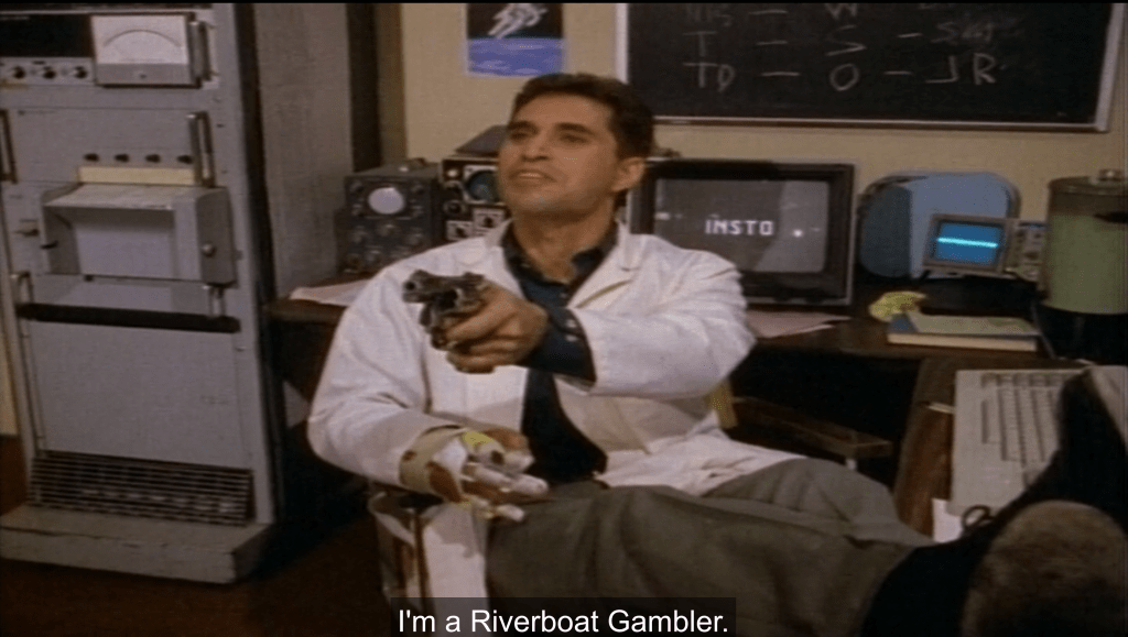 So, we open on this delusional gambling addict who we’re 98% sure is hooking up with his sister. She’s always rubbing his chest and touching him while saying she can’t be around him anymore. Anyway, back to the gambling. How does he get the money for his gambling? Well, he’s a scientist by day doing experiments on UFO and ghost shit. Let’s call him Gambler Scientist. His boss, Republican Scientist, thinks he’s an idiot and his coworker, Monkey Scientist, who works with monkeys, is maybe in love with him? He owes Stone Cold Steve Austin a bunch of money, so he’s getting his bones broken and living in fear of getting murdered. All-day long he dreams of being “a riverboat gambler”, gambling in a little boat room where people wear green visors and lose to him in blackjack. He discovers aliens or some shit and then gets killed by the Mafia.