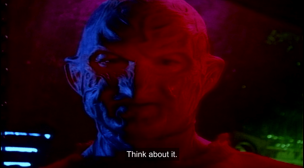 These fucking episodes are impossible to write about because they’re so all over the place. It’s like a shirt stitched together with fabrics from ten other shirts. Everything is mismatched and gets so convoluted it’s hard not to get lost. In fact, you probably understood like none of the previous three paragraphs. This episode is one of the weaker ones to be sure, with only fleeting moments to enjoy. I wish I looking for writing work in 1989 so I could give these episodes some goddamn structure. They would still be awful but I swear I could make them more palatable. Audrey, what did you think of this weird turd of an episode? And would you write for Freddy’s Nightmares if you weren’t a toddler in 1989?
