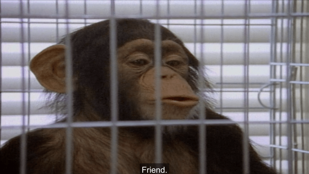 I’m still trying to wrap my head around what happens next but I think…the monkey has a dream? And in the dream, the monkey says the word, “Friend.” So the monkey is buying into this and dreams that he can tell the scientist that he is alive. But he can’t. So he doesn’t. But he really wants to. And then the episode ends. Michael, I have one question for you: What?