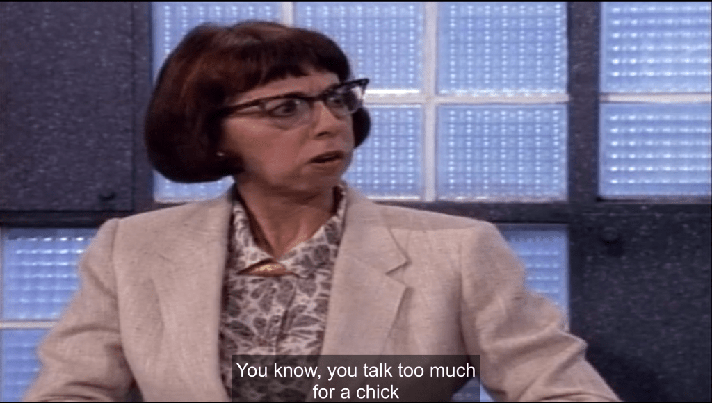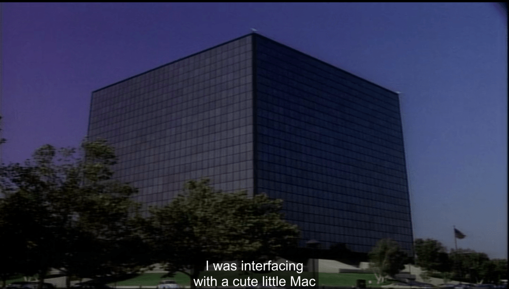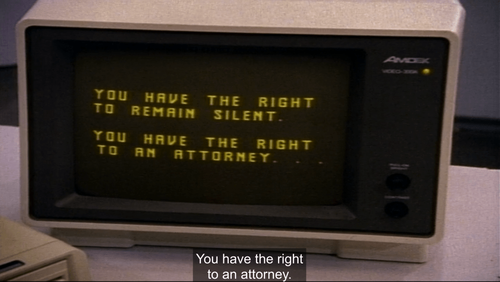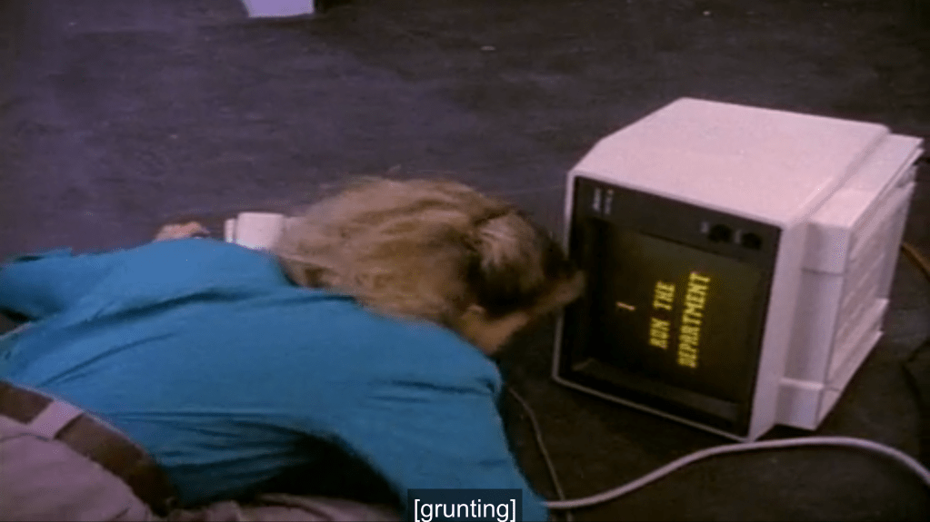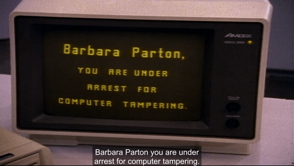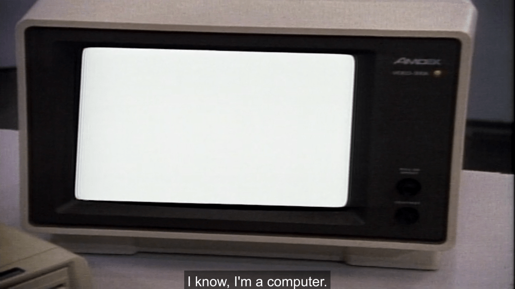 Anyway, the professor dies or something, I dunno, I watched this three weeks ago but it might as well have been three years ago, and the story shifts to one of his students and her day job. She works at some credit place emporium like Audrey said, and she works on a computer. I guess her computer is alive though and a good portion of this story is told in film noir style voice-over from the computer’s POV. The computer talks about having a one-night stand with a Macintosh computer or some shit before trying to capture or kill the main woman. Or kidnap her boyfriend?