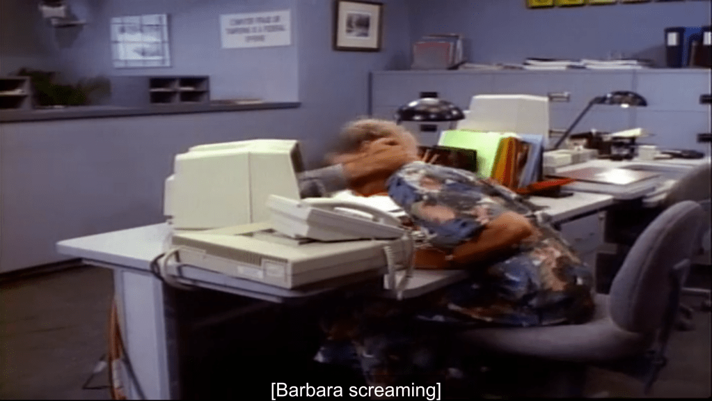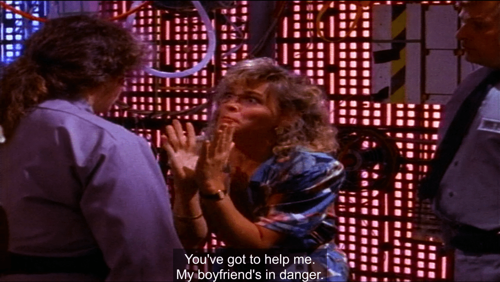 Oh so her boyfriend is a character in a later Season 2 episode, “Monkey Dreams”, which we’ll talk about further down in this article. He’s a monkey scientist and gambling addict who is also having sex with his sister. Anyway, there’s a scene where she destroys his credit because she thinks he stood her up. She apologizes and asks if dinner is still happening, to which he very justifiably responds by breaking up with her. Anyway, she gets arrested by a computer and sucked into a computer/server room. That’s about it. She dies.