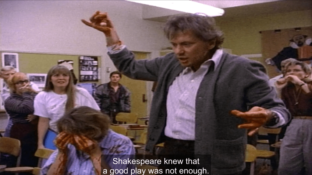 Anyway, I too was a theater major, and the classroom opening of a drunken theater professor pretending to rip out a student’s eyeballs while ranting about the Bard, totally checks out. This guy might be an alky, but he’s a real trailblazing wild card of a knowledge dispenser! It’s easy to see why his students keep falling in love with him, who wouldn’t want to wake up every morning next to a guy that most certainly smells like a decomposing cat? And who would never, ever respect an opinion or interpretation of Shakespeare’s text that doesn’t exactly match his. That’s right, unless you parrot his own opinion in your own words, he’ll verbally dress you down in an effort to persuade you to hate yourself. Don’t sleep your professor, students. Just DON’T do it. They suck. They clearly want to be in a relationship with somebody who worships them as a superior rather than appreciates them as an equal. That’s not a partnership, it’s exploitation. And 97% of the time, they have an itty bitty wittle dick.