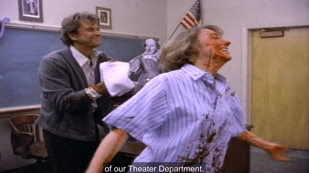 Well, this episode begins with two college girls in a classroom and one of them says to the other one, “The only reason I’m taking English is to stay away from science professors. Because I keep falling in love with them.” What? What, dude? You keep…you keep fuckin’ doing WHAT? Like, all of them? How many science classes have you taken? Do you…want to do science, though? Or are you switching to liking literature because you don’t like literature? Are you maybe just in love with…science itself? None of these questions are answered because the English professor walks in, drunk as shit, and pretends to KILL A STUDENT. By TEARING HER EYES OUT. But it’s actually just a theater major performing! Those fuckers will take any goddamn opportunity, I swear to god. (Note: I was a theater major).