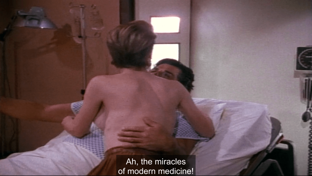 Anyhoo, after the talk show host dies and his co-host has wild sex with him in a hospital bed, the story shifts to the young 20-something dude who receives the talk show host’s dream juice in an emergency transplant??? This doctor just injects him with dream juice from the talk show host’s brain. Of course, this means the 20-something dude adopts the slimy personality of the talk show host and has sex with the co-host in another hospital bed.