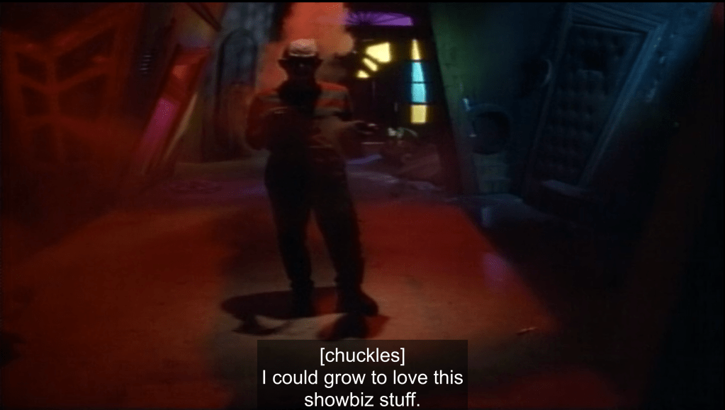 A talk show host wants to do a show about a Freddy victim, but Freddy won’t have it! He tells this motherfucker that he’ll kill him if he does that show! No show! Freddy doesn’t want it! So, they do another show where a guy punches the talk show host so hard, he ends up in the hospital. Okay! Wait…hang on. Freddy is now hosting the talk show. Freddy has taken over the show, and is GRILLING the talk show host on stage. All the guests are passing around the talk show host’s hand and eating it. WAIT IT WAS A DREAM. The talk show host is in the hospital and thinks Freddy is after him, because he is. And guess what? THE DREAM SHOW IS HAPPENING, says the producer, a little baby boy who loves ratings. Then the talk show host girlfriend takes off ALL HER CLOTHES in the HOSPITAL ROOM and they have sex. In the hospital. Normal!