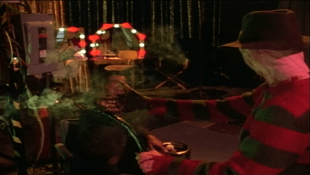 The talk show host doesn’t listen and does the show on dreams only to be murdered by Freddy via electricity. There’s a bizarre, trippy dream sequence where the talk show host gets fired and the studio hires Freddy to replace him. On Freddy’s new late-night show, “Springwood NIGHTMARE!” he has guests ranging from a drag queen to Adolf Hitler. Yes, Hitler is in this episode, with not a single line. On the show, Freddy has the former talk show host tied to a giant charcoal grill where he tortures him.