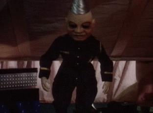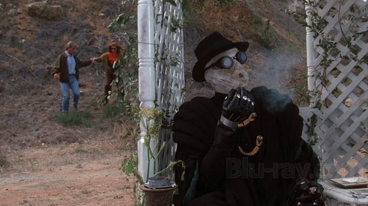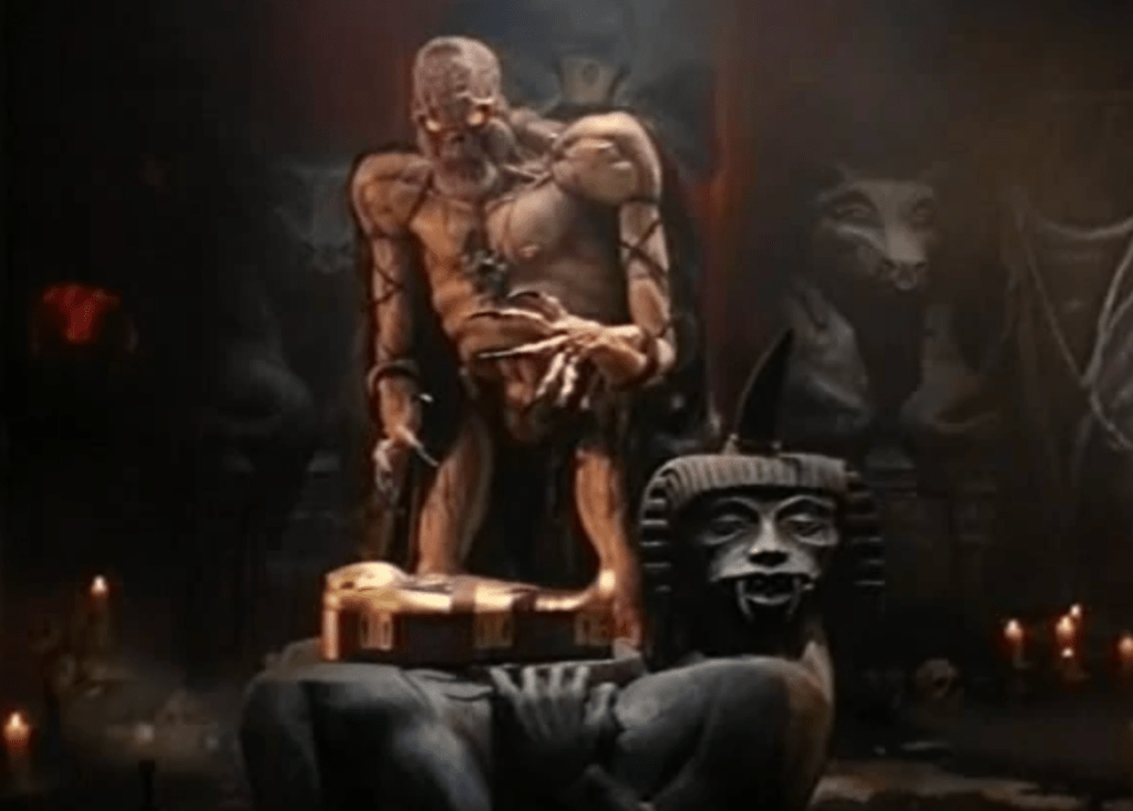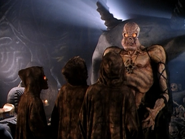 Here’s where the series sheds all of its cynicism and dives head first into “goofy” territory. Blade, Pinhead, and the gang are all good dudes in this one and the bad guy is a giant felt villain straight out of a “the writers came up empty this week” episode of Power Rangers. His name is Sutekh and he wears a cape and a thong. He’s a bald boy with large, glowing orange eyes, a shriveled scrotum for a mouth, and massive back problems. Maybe it’s just the way the sonofabitch is puppeteered, but the way he moves around his lair suggests he has at least two herniated discs, maybe three. So, we’re getting ahead of ourselves, who is this guy? Well, he’s a goofy puppet villain living in an old museum in another dimension. He has a bunch of Jawas that work for him and he’s obsessed with stealing Toulon’s re-animation juice and killing all the puppets. Using telekineses, his Jawas VR themselves into bodies of vicious puppets in OUR world called Totems. Basically, it’s like James Cameron‘s Avatar but not as stupid.