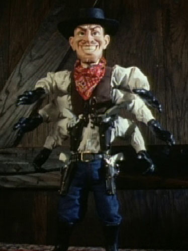 Anyway, the way this thing wraps up is Toulon has a plan to transfer his consciousness into a creepy-looking human body puppet and force Carolyn to transfer into another creepy-looking human body puppet. These to-scale puppets have these bulging eyeballs that look legit frightening. The little puppets see this as a betrayal of what their cause is, so they double-cross Toulon and Torch sets him on fire, delivering the fatal blow. A guess you can still kill a dead guy, but only if he transfers his consciousness into another body that’s a different body than the one he initially died in.