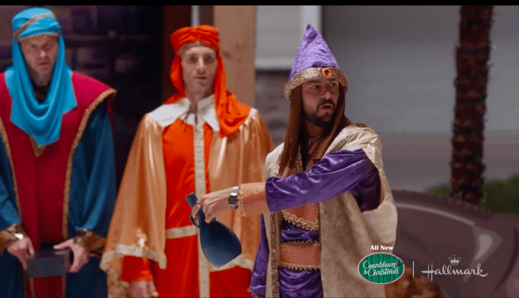 As off-the-rails as a Hallmark movie can go I suppose, they really don’t show much of the crazy stuff that apparently happens. They keep beginning scenes with “Can you believe this happened?” or referencing events, without actually showing you the comedic chaos of that event. I think they were afraid of Three Wise Men and a Baby being too funny. My mom watches Hallmark Channel while she wraps presents and bakes cookies, and if it’s too funny it might distract her into burning the house down. There’s a scene where they dress up as elves with the baby, a scene where they do a dance routine for their mom and girlfriends and a scene where they dress up as – you guessed it – the three wise men for a Christmas House Decorations contest they’ve entered in order to stand up to their asshole neighbor.