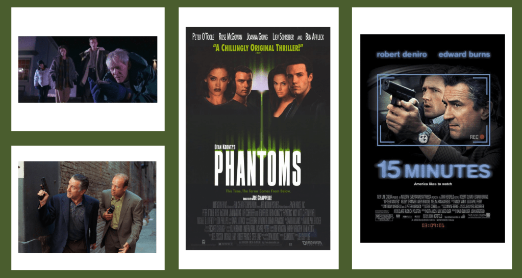 Far worse than a lame Dean Koontz adaptation is a ham-fisted, confoundingly stupid Natural Born Killers rip-off from the early 2001. 15 Minutes (D+) is a laughably cynical and over-the-top police thriller about an insane Russian and an insane Ukranian running around NYC murdering people and videotaping it. They want to be famous because from watching the news and Jerry Springer, they figure America wants to see the most fucked-up shit ever and with unethical lawyers, no one is responsible for what they do. So they can kill a bunch of people, plead insanity and then get a massive book deal and a Geraldo interview. Well, that doesn’t fly with two people – celebrated and famous? NYC old school coperino, Detective Robert DeNiro, and a lame arson investigator played by Edward Burns. They make it their lives’ missions to find and arrest the two killers. The movie really tries to force this buddy cop friendship thing cause one dies halfway through at the hands of the killers. Ooops, spoilers. Fuck off, though, I can’t spoil the movie you were never, ever going to watch in your entire stupid life. That’s impossible.