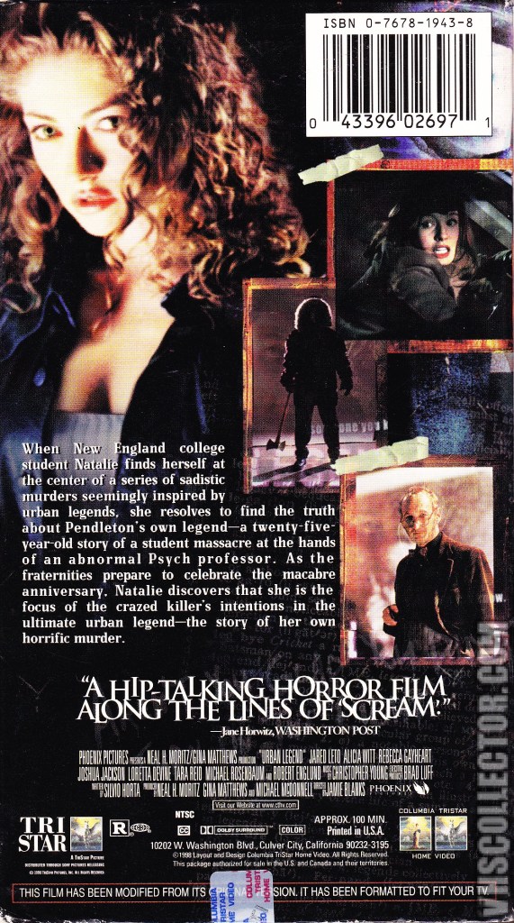 MICHAEL MARGETIS: When I was just a little bambino, I loved watching this well-shot but supremely bland Scream knock-off, Urban Legend. Imagine a killer who kills you based off of urban legends. That’s a clever idea that the filmmakers don’t execute well. When I first saw this, I thought director Jamie Blanks and writer Silvio Horta did a fantastic job with it – I was only about 10. My mom had just gotten the VHS for me from K-Mart. I only knew a little about urban legends besides what I read at my elementary school library – Scary Stories to Tell in the Dark being 90% of what I knew about urban legends. So, from my ten-year-old point-of-view, everything checked out, and the movie was a near masterpiece. In fact, it was a comfort movie in some ways for me. Here’s what was great to me back then: