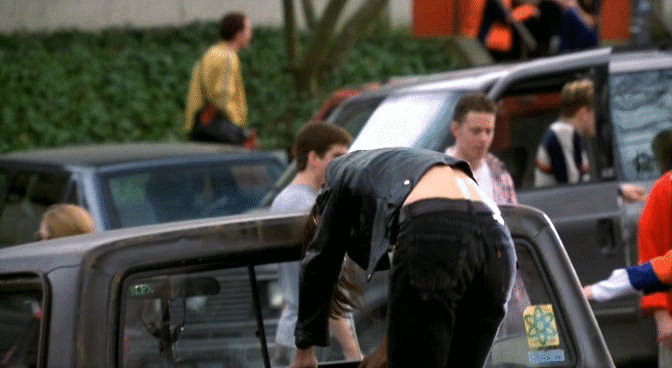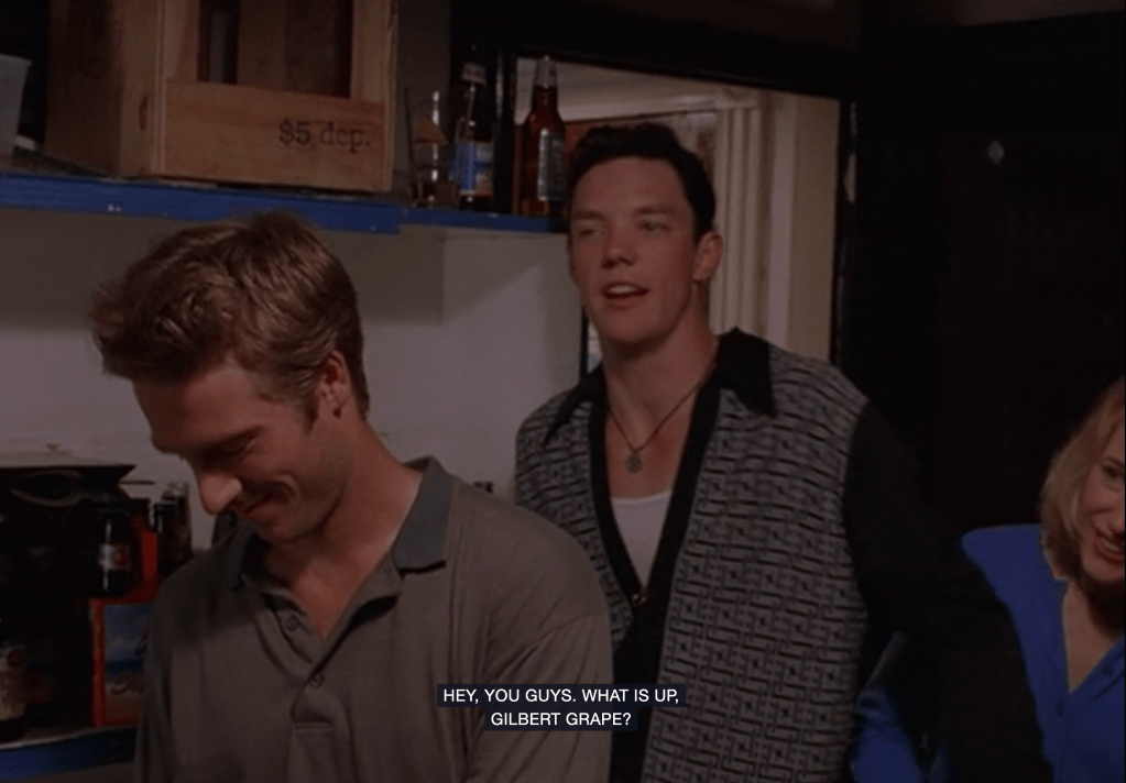They may not be real, but they sure as heck are referential when it comes to pop culture. Even in the opening credits, I counted at least four references to different 90s bands or movies. It’s like somebody put Tarantino and Scream in a blender and then added rat poison. There’s also a scene where the “cool” film students are playing a drinking game based on the Russian roulette scene from The Deer Hunter. Instead of shooting themselves in the head with a revolver, they shake up a brewski and explode it onto their temples. Meanwhile, Matthew Lillard yells at them in fake Vietnamese while every 19-year-old at this party cheers and completely understands this reference. I feel like anyone who has seen The Deer Hunter all the way through would find this tasteless and a total bummer, even stupid teenagers. This is also minutes after Matthew Lillard‘s character takes advantage of a mentally challenged student, referring to him as “Gilbert Grape” in the process. First of all, are we supposed to think this guy is cool? The movie feels like it’s trying to score a laugh through this character’s abuse of a special needs student. Second of all, “Gilbert Grape” was Johnny Depp‘s character in the movie, not the mentally challenged brother (played by Leonardo DiCaprio).