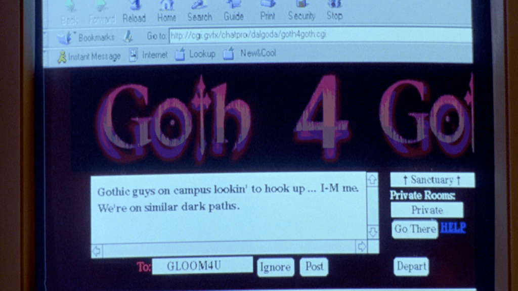 Do watch if you’re a fan of terrible 90’s songs. ‘Zoot Suit Riot’ and knockoff Nine Inch Nails blares at a college frat party where a dog does a beer bong then gets microwaved. Alicia Witt’s bitchy goth roommate’s sex/murder scene is scored by ‘Dragula.’ She was sadly tricked by the killer via chatroom, the first known case of cat-fishing in a movie. I may need to fact check this.