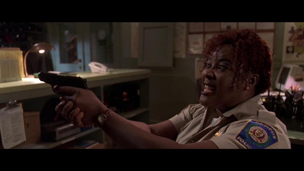 I like a lot of things about this movie. We get Courtney Cox’s best haircut of the whole franchise, for one thing. I like how Dewey just shows up and starts hanging around on campus – he’s literally introduced standing under the shade of a tree looking befuddled, like a kindergartener that accidentally got off at the wrong bus stop. I was also reminded of this franchise’s running gag of having Dewey get progressively more fucked up in each subsequent sequel, which is fun. David Arquette plays Dewey as this kind of… manic simpleton, I guess? I dunno, it’s kind of hard to explain, but it works, and he and Courtney Cox have some good chemistry together.
